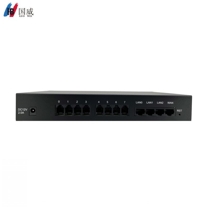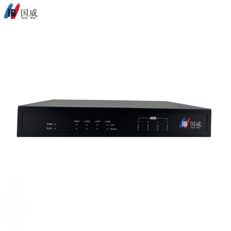 1、19寸1U铁壳机架式通信设备,采用高性能ARM双核CPU、512MB内存,全并发、8个RJ11电话FX0接口、1个WAN口,3个LAN口网络接口,1个RST复位孔、18个功能状态运行指示灯、1个电源适配器接口。具备忙音检测、呼叫轮询、回音消除、WEB管理等功能,为语音系统提供模拟外线接入或者外线端口扩展,最大功耗25W,重量2.5KG、尺寸440*150*44mm。